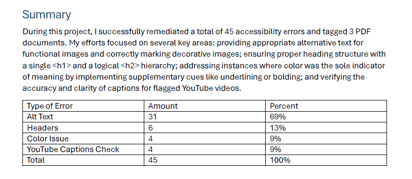 This project focused on exploring real world accessibility issues and how to properly fix websites and Canvas course shells.